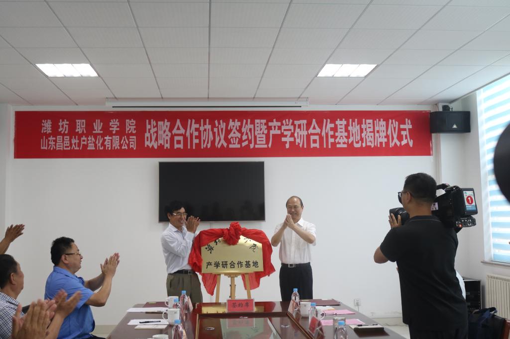 马跃启、付忠东共同为潍坊职业学院产学研合作基地揭牌。贺志强与高建伟共同签署了校企双方战略合作协议。