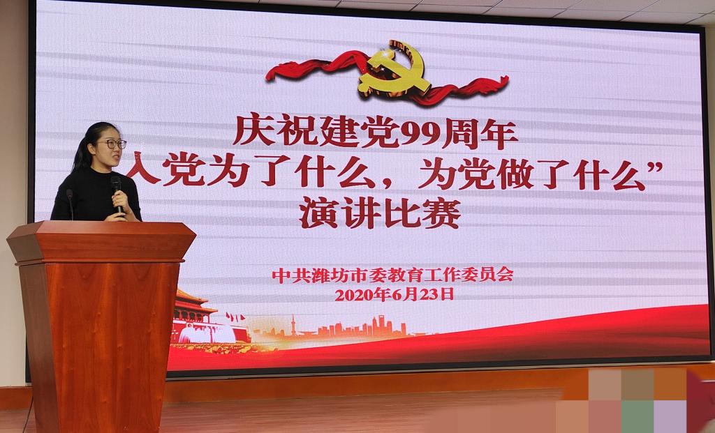 为热烈庆祝中国共产党成立99周年,进一步加强教育系统党的建设,强化思政教育和爱国主义教育,6月23日上午,由潍坊市委教育工委主办的“入党为了什么,为党做了什么”主题演讲比赛在市委教育工委党校举行。我院国际商务学院党总支谭恒同志代表学院参加比赛并获二等奖。