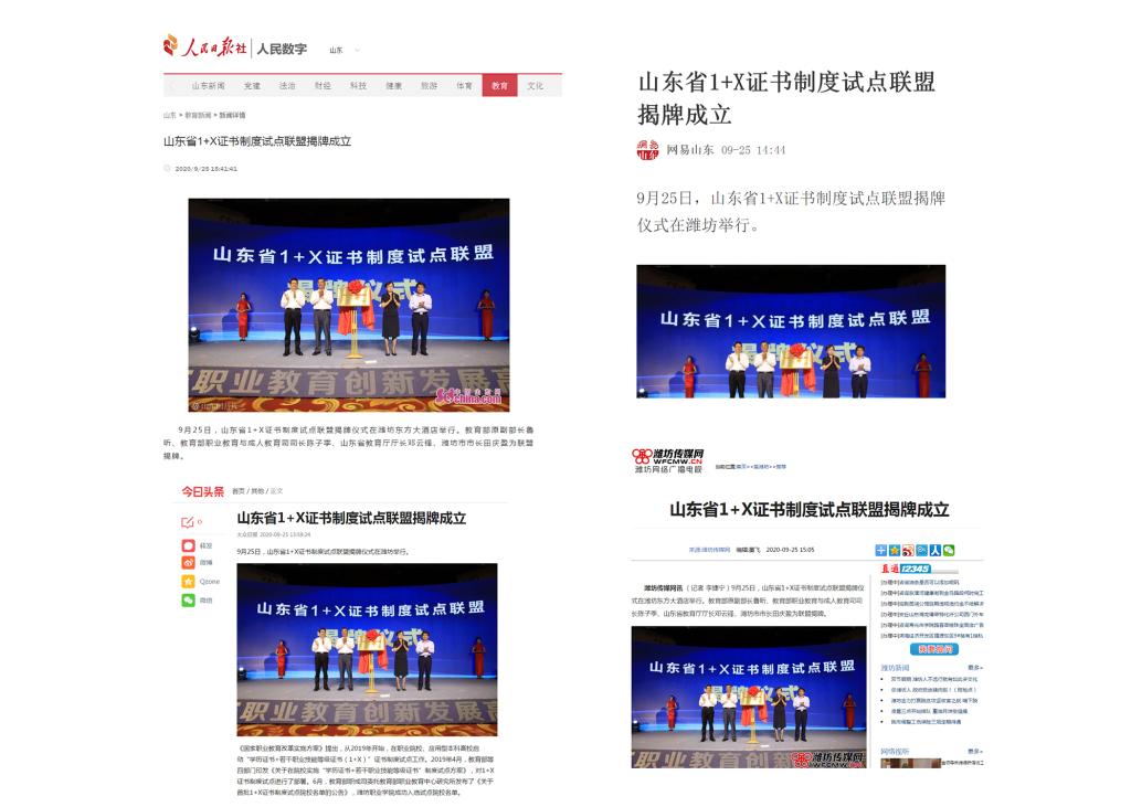 联盟成立后,在社会引起广泛反响,人民网、山东电视台、大众日报、山东教育电视台、潍坊日报、网易等多家新闻媒体进行了集中报道和现场直播,详细介绍了我院牵头组建山东省1+X证书制度试点联盟的情况。
