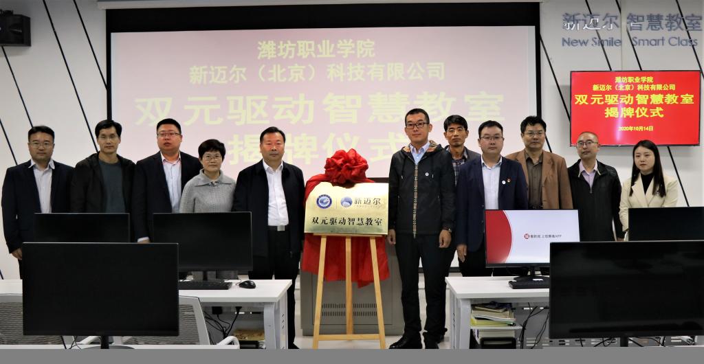 贺志强和刘洋共同为双元驱动智慧教室揭牌,并分别致辞祝贺。贺志强祝贺新迈尔双元驱动智慧教室顺利验收并揭牌。感谢新迈尔(北京)科技有限公司对学院的诚心合作和投入。他强调,希望新迈尔(北京)科技有限公司在硬件投入的基础上加强教学研究改革,深化校企合作,多出成果,祝愿双方合作更上一层楼。刘洋对潍坊职业学院的支持表示感谢,并表示在今后的合作过程中,继续加大投入完善相关教学设施设备,加强交流合作。(王璐供稿)