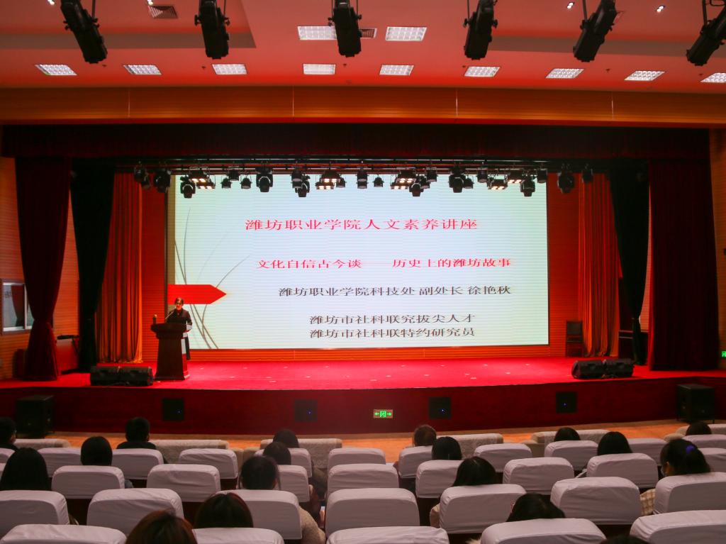 11月26日,学院第58场人文素养讲座在滨海校区图书馆报告厅举行,科技处徐艳秋博士为同学们作了一场题为“文化自信古今谈——讲述潍坊故事”的讲座,滨海校区200余名师生聆听了讲座。