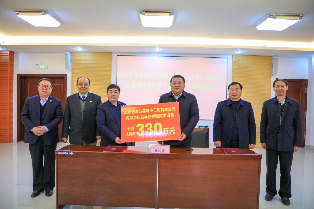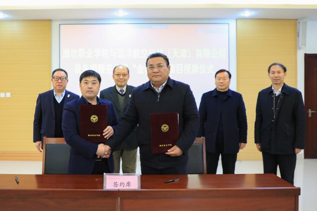 王家爱代表学院与远洋航空科技(天津)有限公司董事长张毅共同签署了《潍坊职业学院与远洋航空科技(天津)有限公司捐赠协议》,并接受远洋航空科技(天津)有限公司捐赠的价值330万元教学设备。