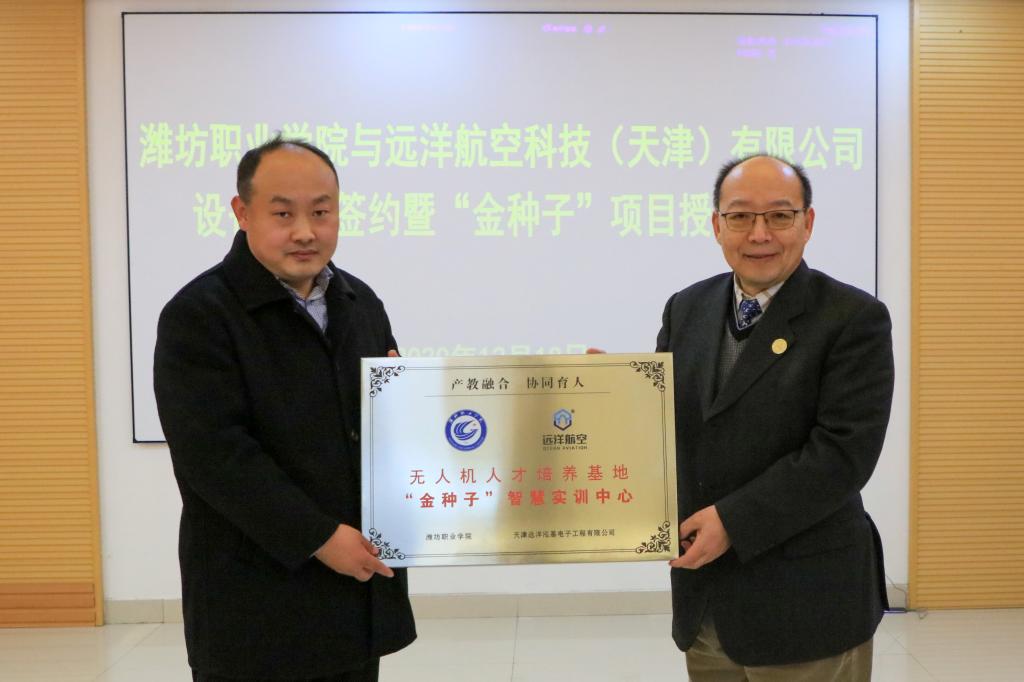12月18日下午,潍坊职业学院与远洋航空科技(天津)有限公司在滨海校区清泽楼312会议室举行设备捐赠签约暨“金种子”项目授牌仪式。学院院长王家爱、副院长贺志强、李瑞昌,欧洲科学院荣誉院士、深圳无人机行业协会会长杨金才,远洋航空董事长张毅、董事长助理卓士远,副总经理王少兴,“金种子”项目院校代表、我院教务处、科技处、资产处、机电工程学院负责人和师生代表参加了仪式。