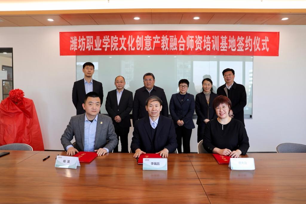 12月21日,潍坊职业学院文化创意产教融合师资培训基地签约仪式在完美世界教育(北京)有限公司举行。出席揭牌和签约仪式的有学院院长王家爱、副院长李瑞昌,教师工作部、文化创意学院主要负责人,完美世界教育首席运营官刘建新、副总裁杨昊、院校合作部北方区总监邢雷,北京无限智联科技有限公司总经理吴垠、副总经理曹大治、市场总监郑德等三方代表。