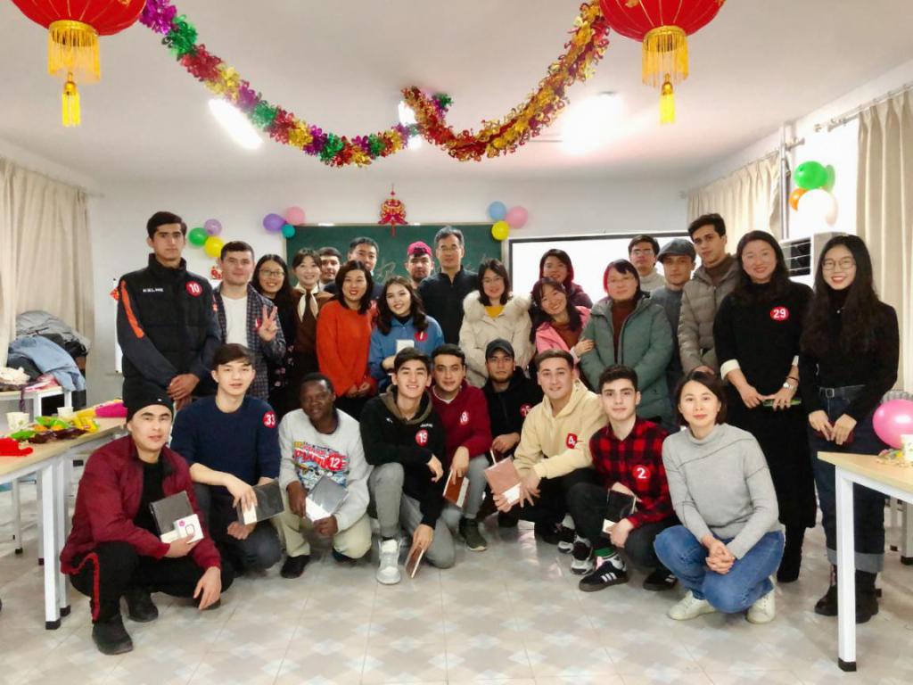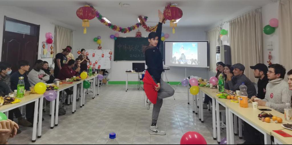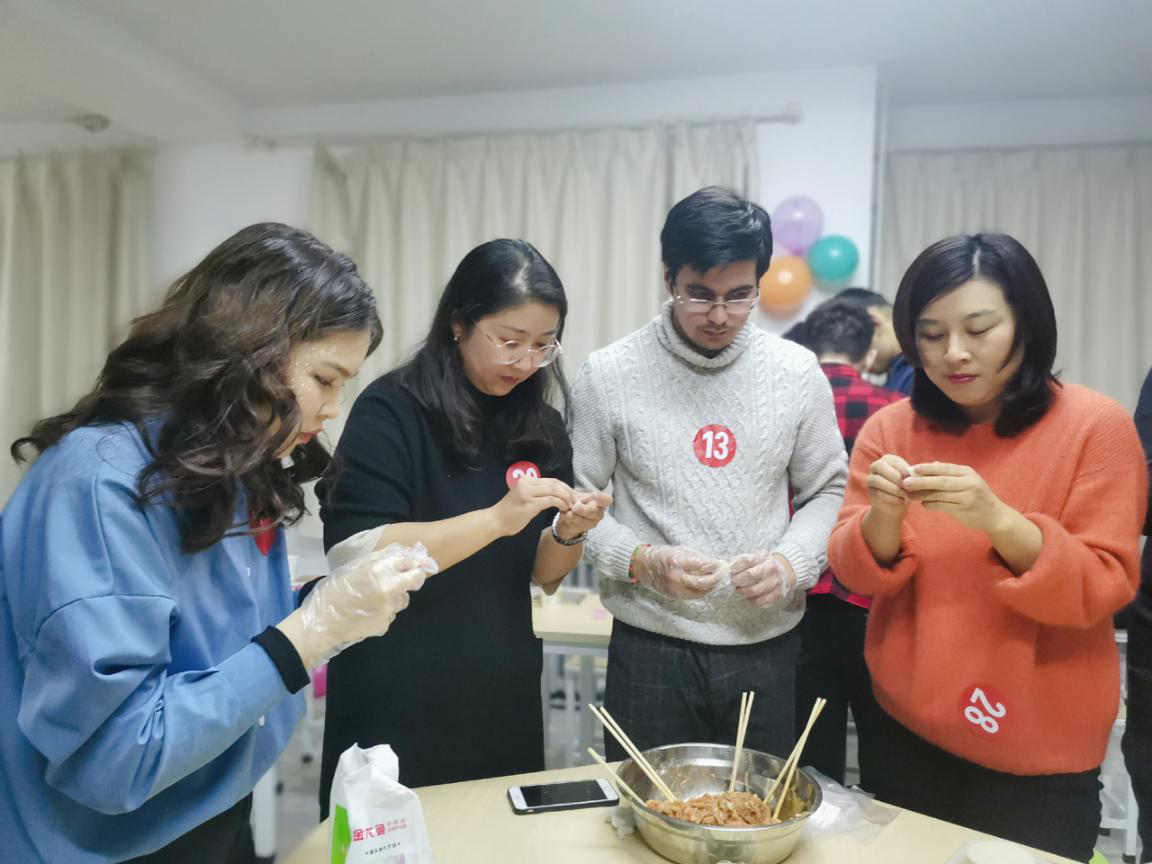 李瑞昌向全体留学生献上新年祝福,观看了留学生在学校生活的视频以及国际教育学院师生的新年祝福视频,共同回顾过去、展望未来。联欢活动形式多样,内容丰富,精彩不断,师生共同参与“猴子蹭蹭蹭、看图猜猜猜、快乐传传传”等游戏活动,留学生尽情展示才艺,分享本国特色美食,现场欢声笑语,节日气氛浓厚。最后留学生们一同参与包饺子,体验中国传统美食。