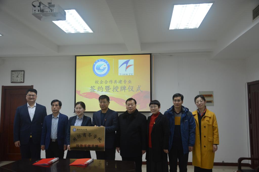 1月12日下午,我校与潍坊天泽人力资源管理有限公司共建专业签约暨校外实训基地授牌仪式在奎文校区会议室举行。学校副校长贺志强、潍坊天泽人力资源管理有限公司总裁董文华、学校科技处、国际商务学院负责同志等出席了仪式。