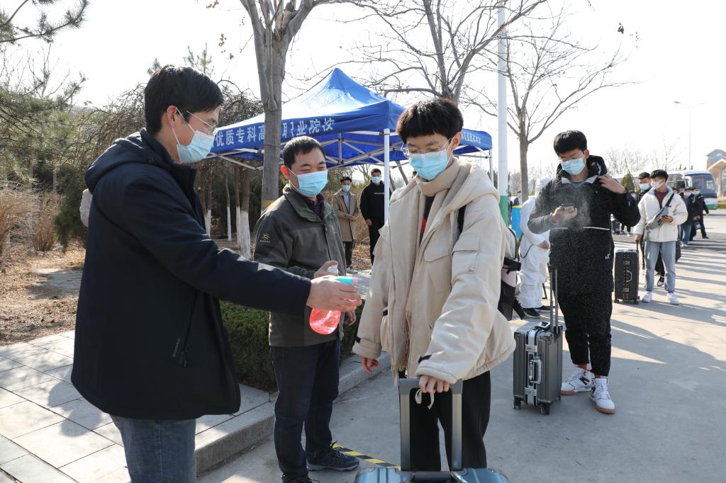 本次演练严格按照《潍坊职业学院2021年春季学期开学学生返校报到演练方案》进行,主要设“学生乘坐私家车报到”、“学生乘坐公交车报到”、“学生身体突发异常处理”、“学生到达公寓入住”、“学生食堂就餐防疫”五个场景。在入校专用通道,演练工作人员对学生进行消杀消毒、体温检测、健康绿码查看、身份核验,重点演练了学生身体异常应急处置程序。在学生公寓,利用人脸翼式速通门禁系统,对学生进出公寓进行双向核验和智能测温人脸识别,演练了学生自感身体不适应急处置流程。