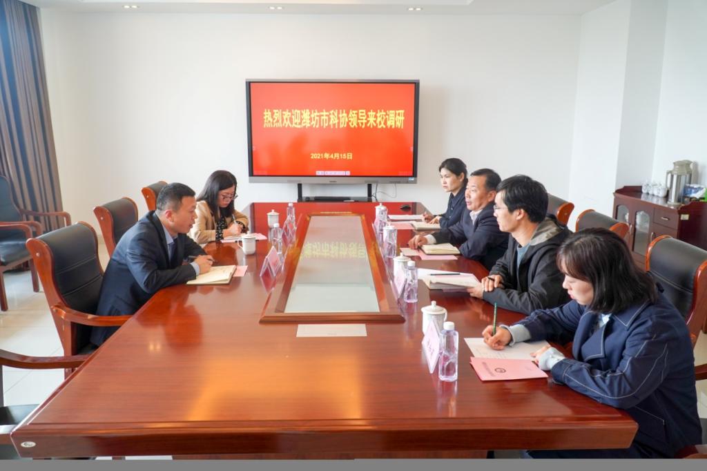 4月15日下午,潍坊市科学技术协会党组成员、副主席尹以成,学会部部长高建杰一行来校开展调研活动。学校副校长贺志强出席,科技处相关人员参加调研交流。