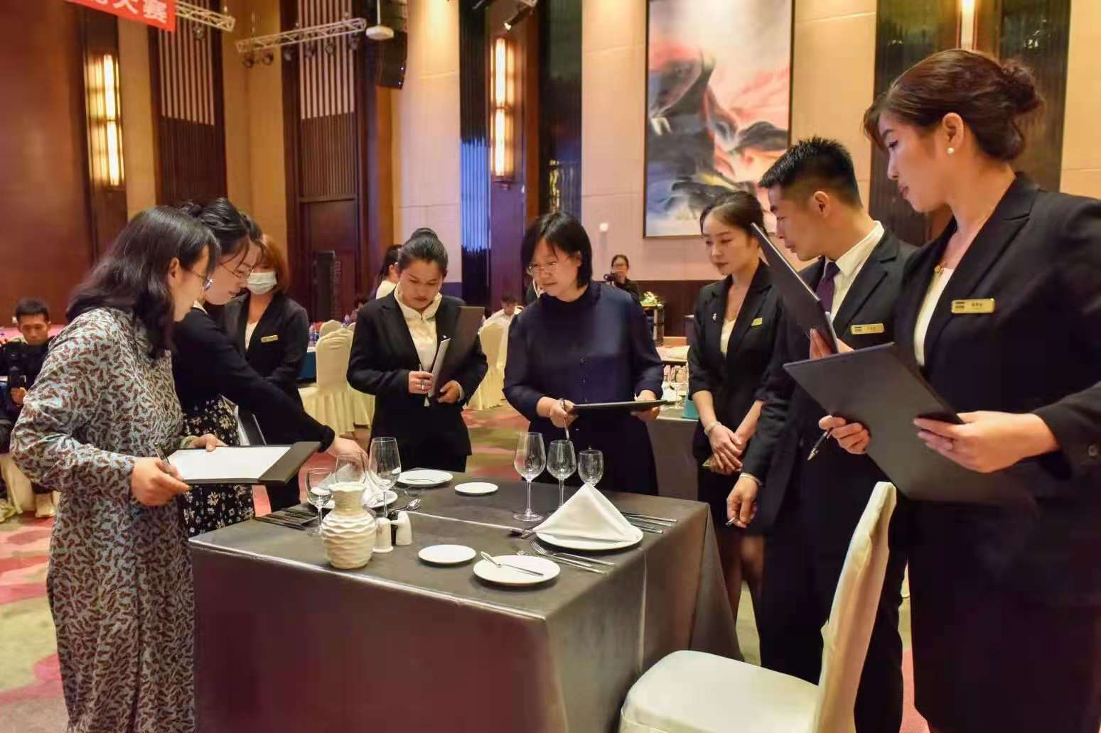 本次酒店服务技能赛项决赛共设中餐宴会摆台、西餐零点摆台、中式铺床三个项目,潍坊蓝海大饭店餐饮部、客房部等3个部门的主管和学院旅游管理专业3位骨干教师担任决赛评委。比赛中,18名同学分组依次亮相展示技能,他们操作到位、技术娴熟,动作优雅利索、仪态落落大方,使得紧张的比赛充满艺术的美感,展现了我校学生良好的精神风貌和技能水平。比赛项目结束后,旅游管理专业学生进行了“百人餐巾折花”集体展示,在指导老师的口令指挥下,同学们将手中的一方餐巾依次变幻出15种动植物、物品造型,动作整齐划一、操作迅速到位,令人拍手叫绝,展现了同学们扎实的专业基本功。
