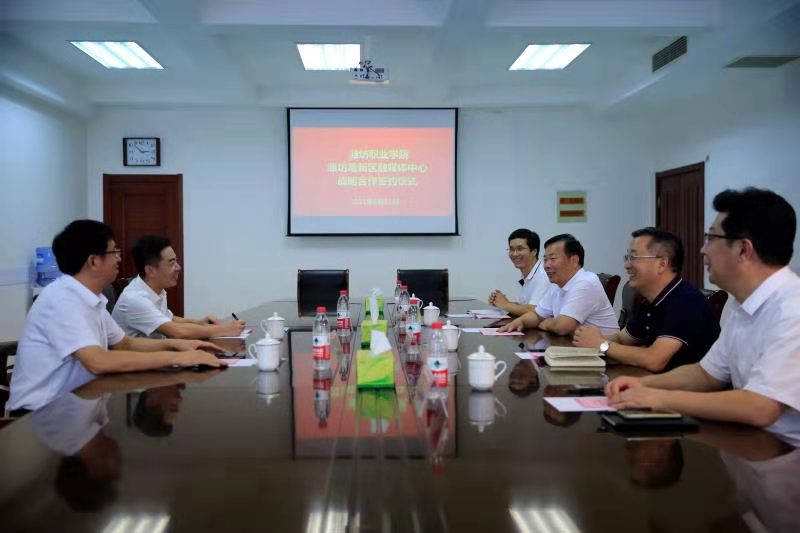 8月11日下午,潍坊职业学院与潍坊高新区融媒体中心战略合作签约仪式在奎文校区11号楼第二会议室举行。学校副校长贺志强,潍坊高新区党工委委员、管委会副主任、党群工作部部长贾延庆,潍坊高新区融媒体中心主任王国栋,学校党委委员、办公室(统战部)主任(部长)任培华及科技处、文化创意学院主要负责人等出席了仪式。