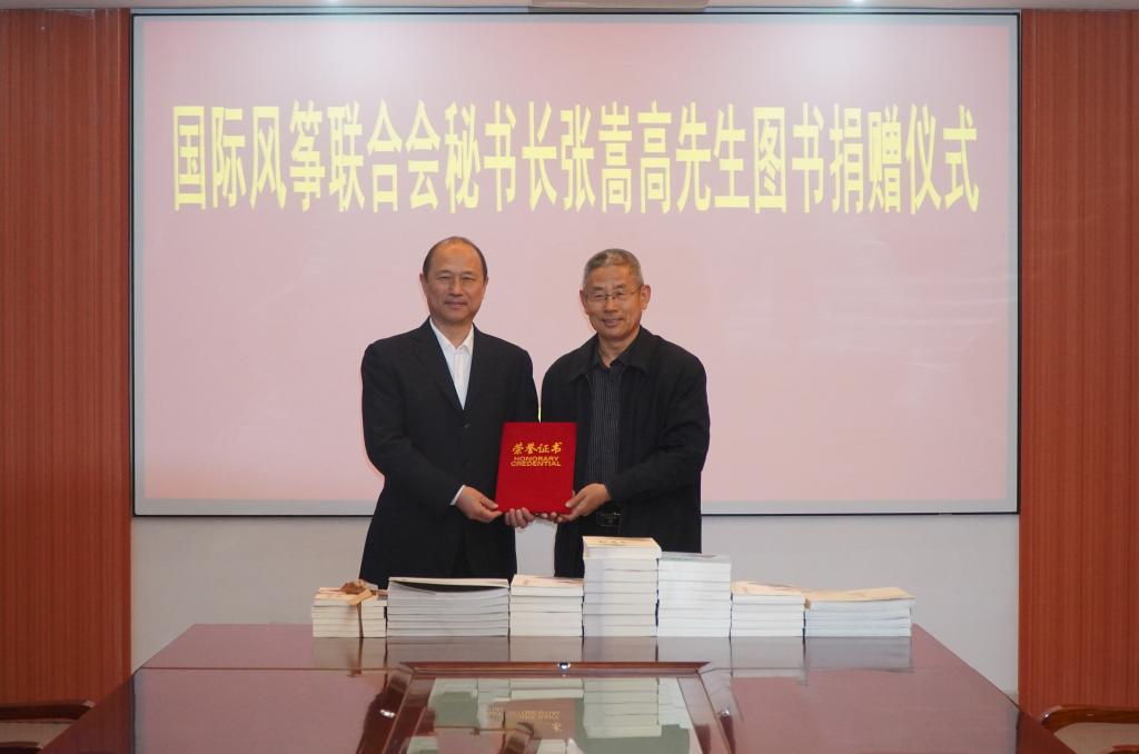 12月10日,国际风筝联合会秘书长、市政协常委、教科卫体委副主任、省督学张嵩高一行6人,来我院进行风筝文化进校园情况调研并向学院捐赠了图书。捐赠仪式在滨海校区会议室举行。学院党委书记马跃启,党委委员、副院长李瑞昌及图书馆负责同志参加。马跃启书记代表学院为张嵩高秘书长颁发了捐赠证书。