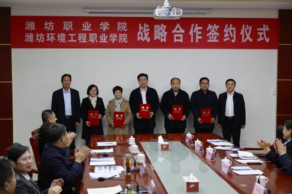 12月13日下午,学院与潍坊环境工程职业学院战略合作签约仪式在潍坊环境工程职业学院举行。学院党委书记马跃启,昌邑市委书记吕珊珊参加活动并致辞讲话。昌邑市委副书记、市长李玉祥、副市长赵海龙,潍坊职业学院党委委员、副院长李瑞昌,学院部分职能部门及二级学院负责人,潍坊环境工程职业学院校领导班子全体成员参加了活动。会议由昌邑市委副书记、市长李玉祥主持。
