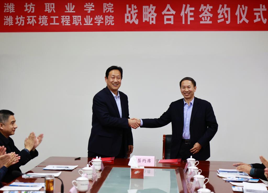 签约仪式上,潍坊职业学院副院长李瑞昌与潍坊环境工程职业学院校长黄官祝共同签订了战略合作协议,潍坊环境工程职业学院党委书记赵卫东为我院教师颁发了客座教授聘书。
