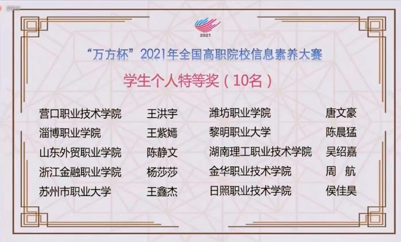 12月12日,第三届“万方杯”全国高职院校信息素养大赛决赛答辩赛圆满结束。我院机电工程学院唐文豪同学凭借扎实的信息素养基本功与良好的心态,在全国众多参赛选手中脱颖而出,以全国第六名的成绩荣获特等奖,信息工程学院蔡晓宇同学荣获三等奖,我院图书馆获最佳组织奖。我院也是山东省自去年以来连续蝉联特等奖的唯一院校。