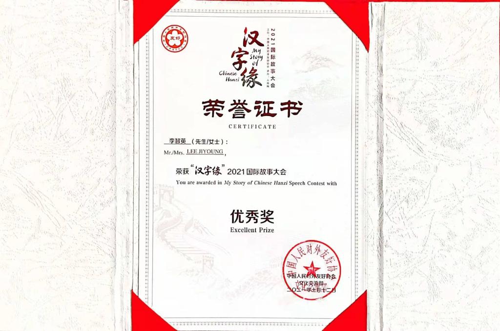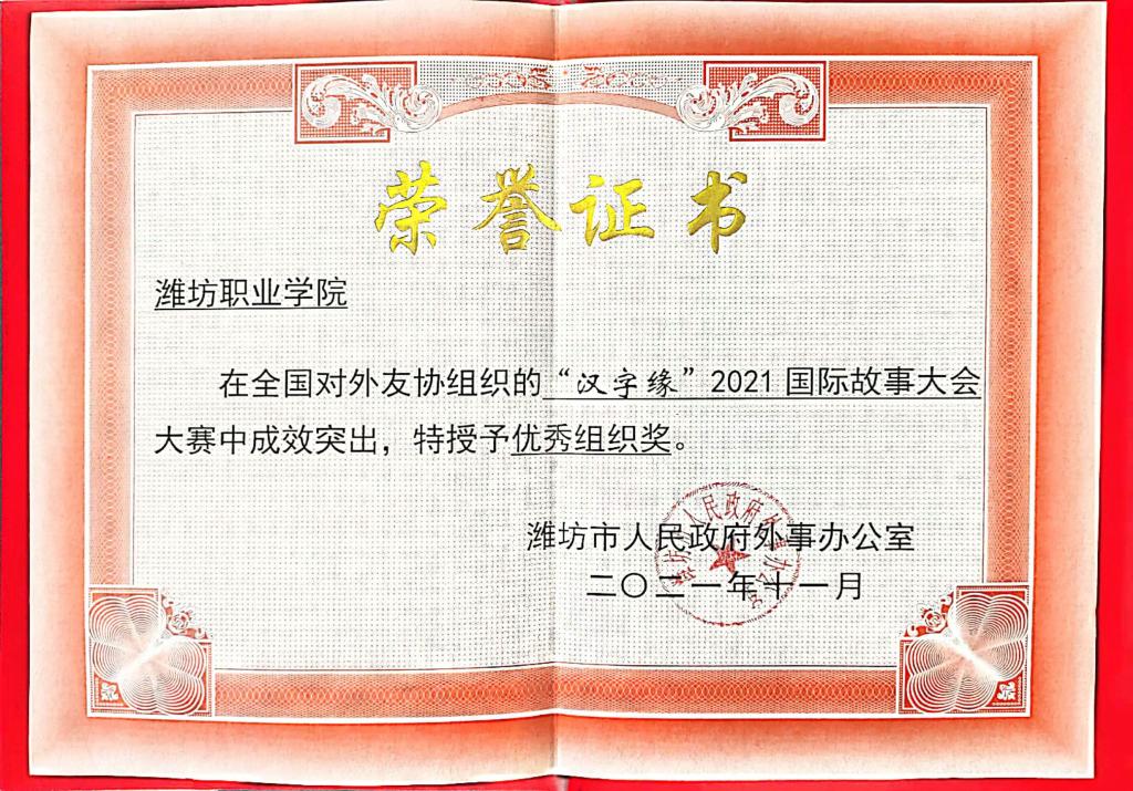 学院国际交流与合作处积极组织学院外籍教师参与本次比赛,精心组织视频录制,经过激烈角逐,我院韩国籍李智英老师以潍坊市唯一晋级者身份顺利进入复赛,荣获中国人民对外友好协会颁发的“汉字缘 2021年国际故事大会优秀奖”证书。我院荣获潍坊市人民政府外事办公室授予的“汉字缘 2021年国际故事大会”优秀组织奖。