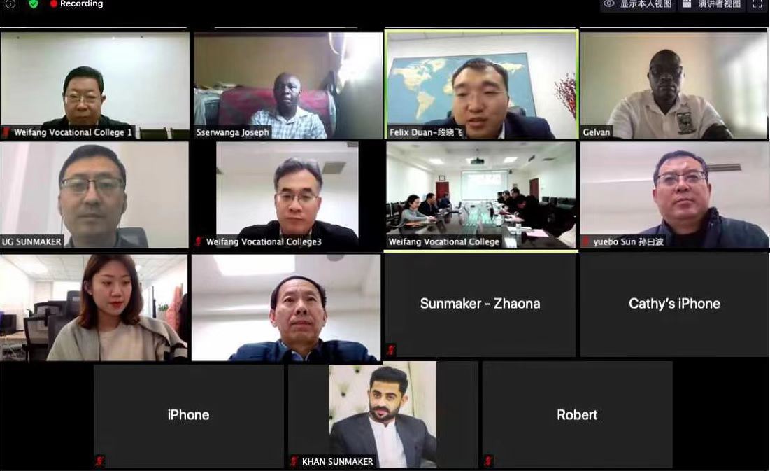 会上,创造太阳乌干达石油学院校长助理许海军回顾了自2020年以来的项目进展情况,包括前期商定合作专业并完成两门国际课程开发。桑福岭就项目取得的成绩和未来发展方向发表致辞。三方就学历生招收、师资培训、短期技能培训、后期课程开发等合作事项进行深入讨论,在人才培养方案建立、数字化教学资源开发、专业汉语培训、后续招生等方面达成多项共识。国际交流与合作处负责同志介绍了“相聚‘汉语桥’开启中国园艺文化之旅”项目,乌干达布卡拉萨农学院将组织师生积极参与该项目的注册和学习。李瑞昌就本次会议成果和下一步工作作出总结。