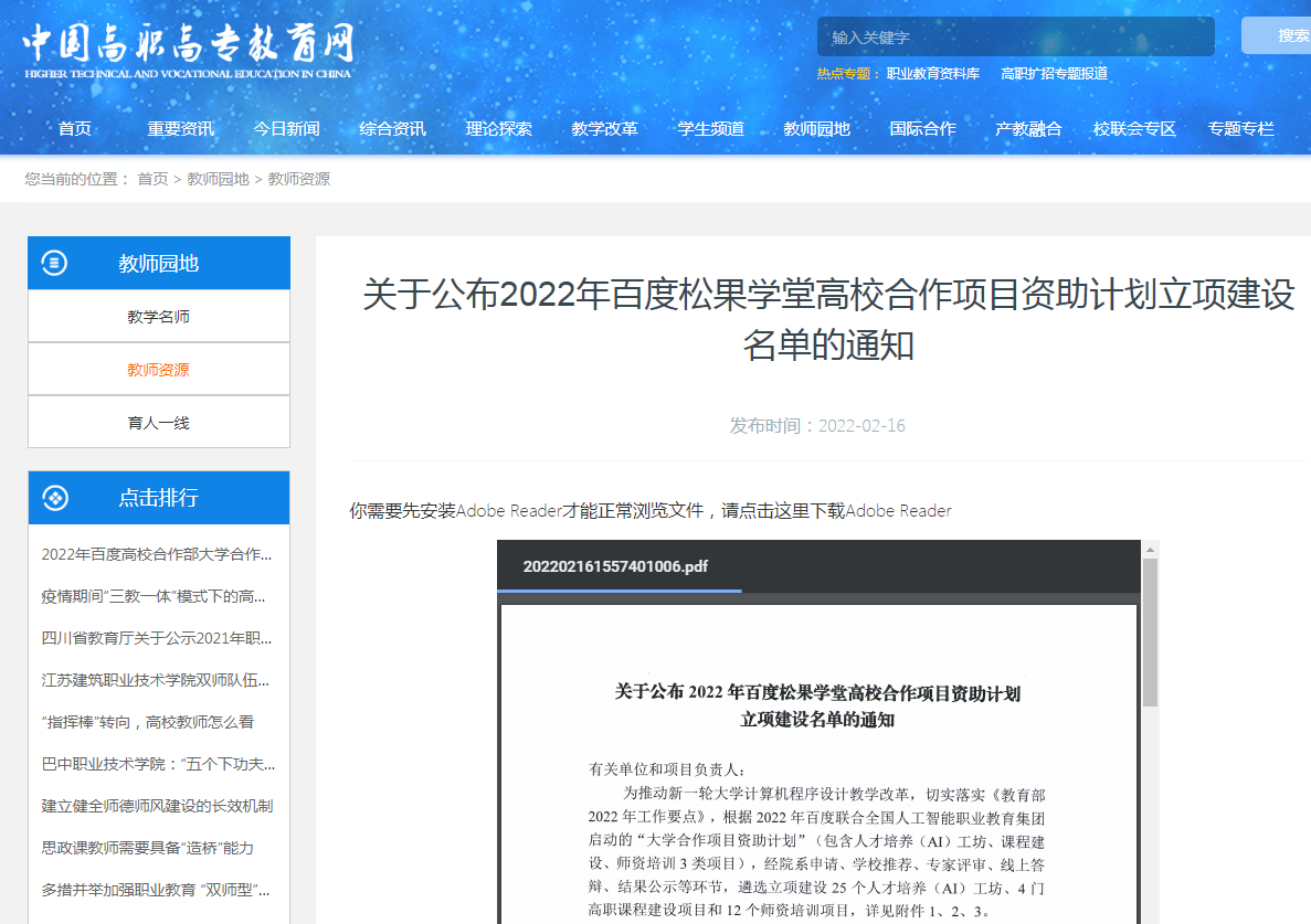近日,中国高职高专教育网发布了“关于公布2022年百度松果学堂高校合作项目资助计划立项建设名单的通知”,我院入选全国首批百度松果人才培养(AI)工坊立项建设单位。