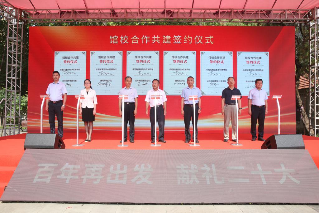 启动仪式上,乐道院潍县集中营博物馆与我院在内的6所高校签署馆校共建协议,合作共建红色文化教育实践基地。基地旨在加强对师生的爱国主义教育,推动校园文化建设,提高精神文明水平,传承红色文化,赓续红色基因,共同培养全面发展的高素质人才。活动结合“百年再出发,献礼二十大”的主题,确定七月份为潍坊市2022年红色文化主题月,并将集中开展红色文化作品的创作和传播,营造浓厚的红色文化宣传氛围。