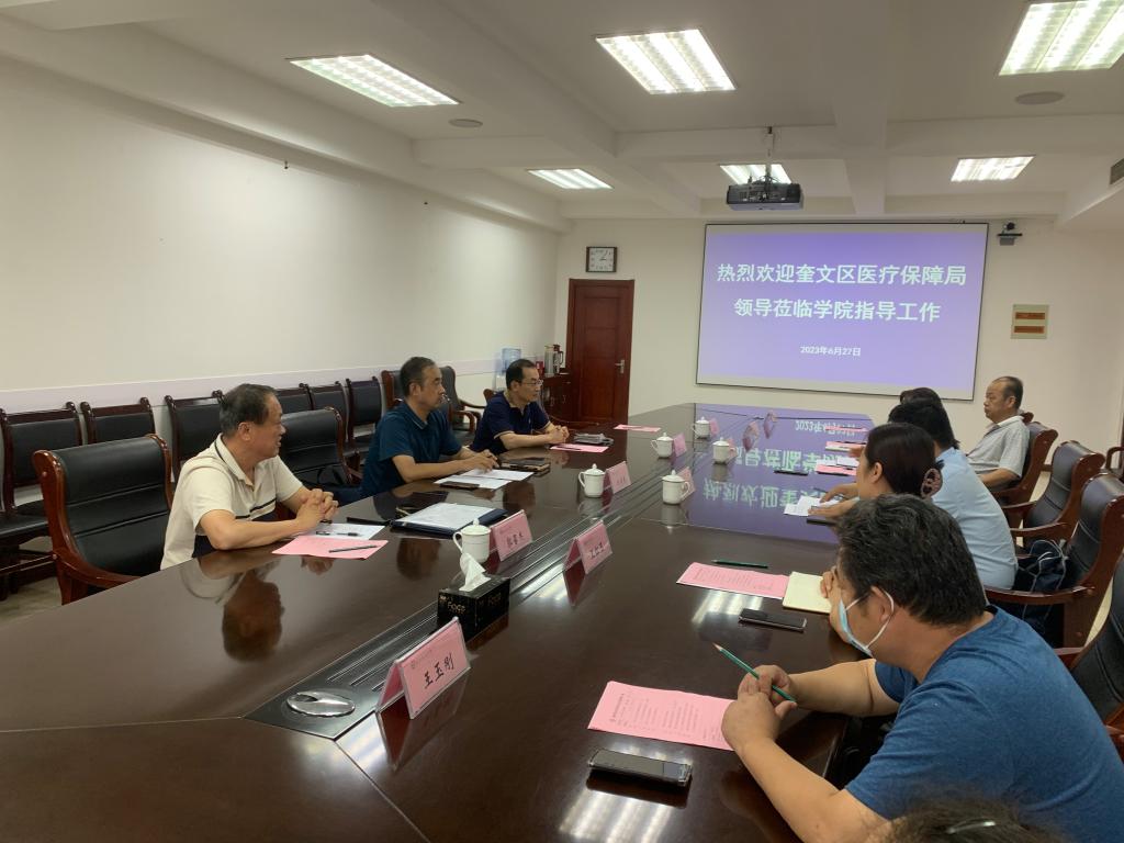 6月27日,奎文区医疗保障局局长刘庆春一行四人到学院奎文校区调研大学生医保参保工作。学院副院长陈美霞,团委学生工作处、后勤服务处、文化创意学院等部门相关同志参加活动。
