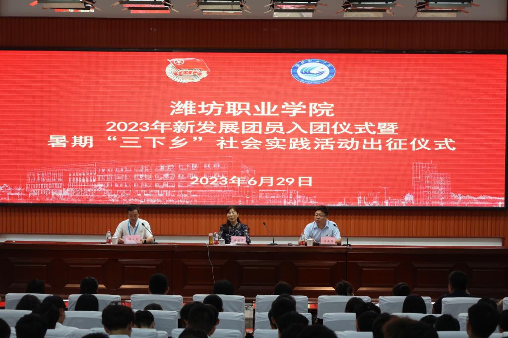 6月29日下午,学院2023年新发展团员入团仪式暨暑期“三下乡”社会实践活动出征仪式在滨海校区清泽楼报告厅举行。学院副院长陈美霞同志、团委学生工作处主要负责同志、各二级学院团总支书记、辅导员代表、2023年新发展团员及2023年暑期“三下乡”社会实践团队代表等300余人参加活动。
