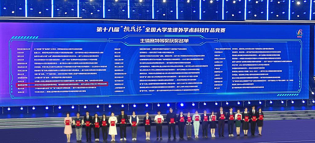 “挑战杯”全国大学生课外学术科技作品竞赛已举办十八届,每两年一届,目前已成为覆盖全国所有高校、面向全体高校学生、影响最大的赛事活动之一。本届竞赛由共青团中央、中国科协、教育部、中国社会科学院、全国学联、贵州省人民政府共同主办,吸引全国2000多所高校、250多万学生参赛,作品数量40余万。经过校级初赛、省级复赛和全国决赛,本届竞赛主体赛共有713个项目进入全国决赛终审答辩,最终评选出特等奖117个,其中职业院校获特等奖8项,我院为其中之一。