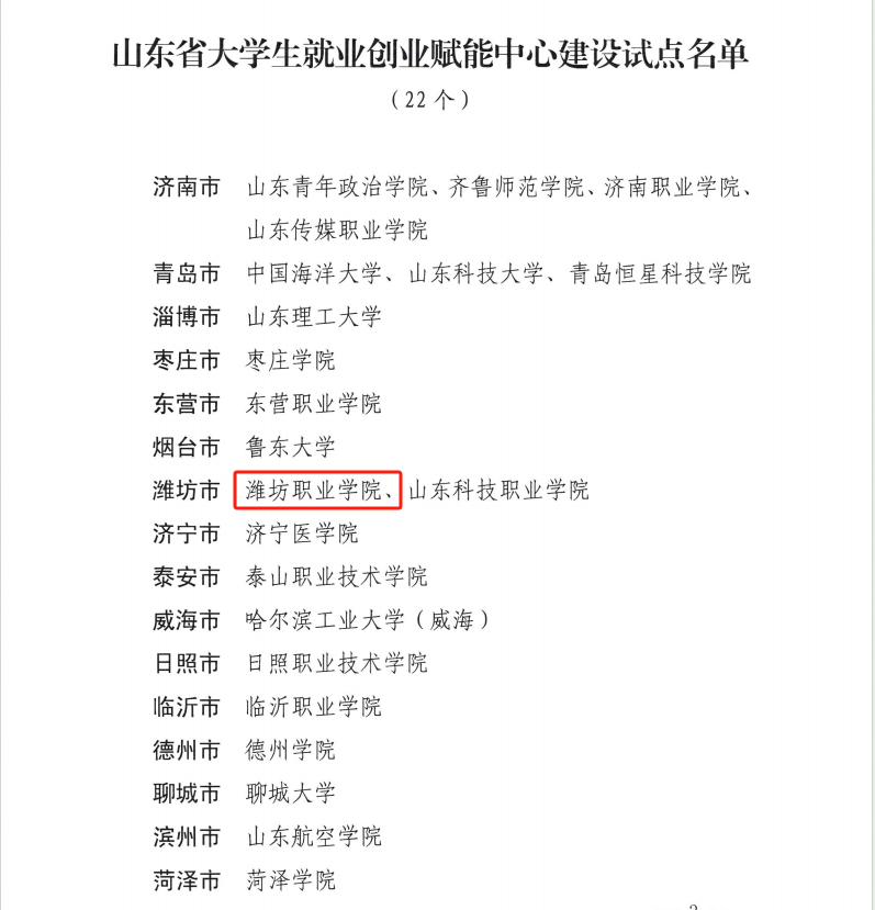 5月6日,《山东省人力资源和社会保障厅、山东省教育厅、山东省财政厅关于公布山东省大学生就业创业赋能中心建设试点名单的通知》正式发布,首批试点名单共有来自全省16地市22所高等院校,我院入选山东省大学生就业创业赋能中心建设试点,这是学院就业创业工作的又一省级标志性成果。