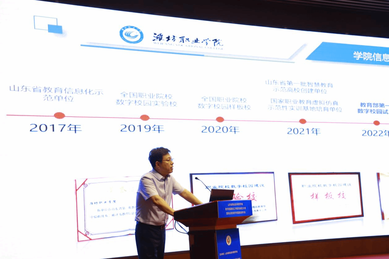 9月29日,由山东省职业技术教育学会主办的职业院校数字校园建设研讨会在青岛召开,全省近百所中高职院校120余人参会。我院发展规划处负责人(信息管理中心主任)在会上做了题为《推进教育数字化转型的潍职模式与实践》的经验分享。
