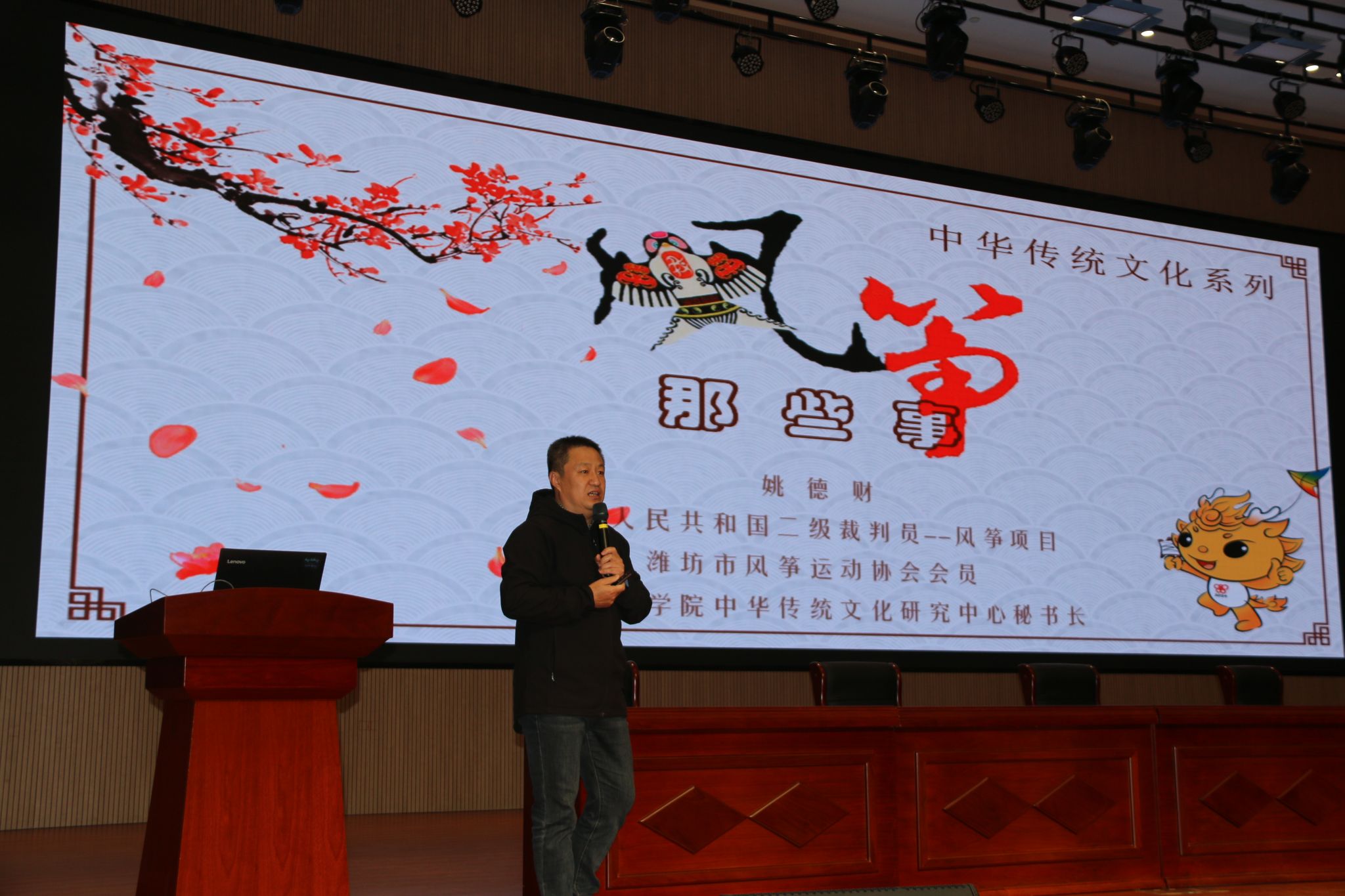 姚德财老师是国家二级裁判员(风筝项目),潍坊市风筝运动会协会会员,潍坊职业学院中华传统文化研究中心秘书长。姚老师以潍坊风筝大赛为切入点,对大赛竞赛项目、竞赛规则等进行了讲解。随后,姚老师从“鸢远流长”“巧夺天工”“蒸蒸日上”“海纳百川”“驰名中外”五个方面对潍坊风筝进行了详细介绍,同时向同学们展示了龙头蜈蚣等具有代表性的风筝作品。姚老师还详细介绍了风筝的制作工艺,包括选材、扎架、糊纸、绘画等各个环节。他指出风筝的制作不仅是一门技术,更是一门艺术,每一只风筝都蕴含着匠人的心血与智慧。姚老师呼吁同学们共同关注和支持非物质文化遗产的保护与传承,让中华优秀传统文化在新时代焕发出新的光彩。