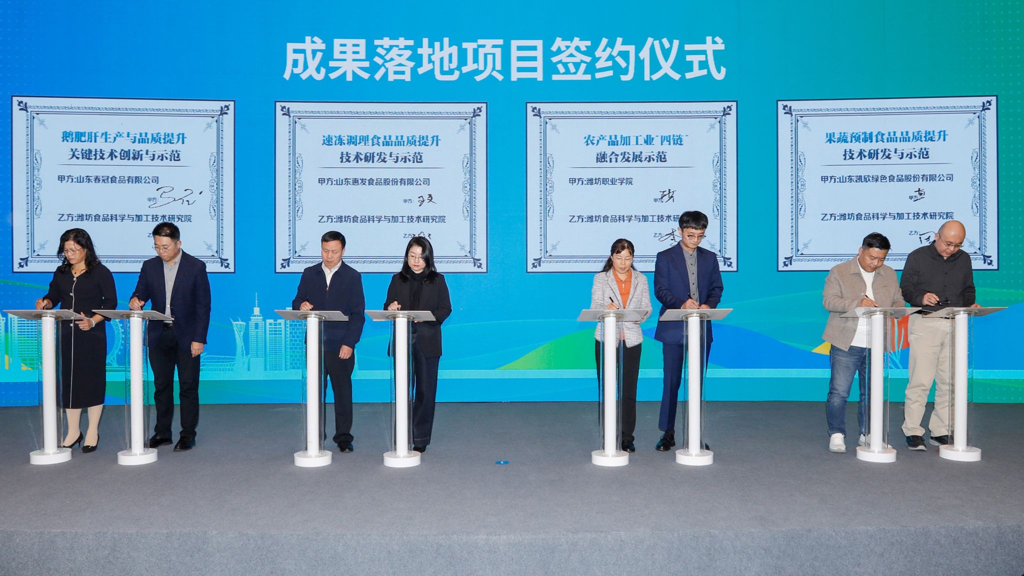 会上,潍坊食品科学与加工技术研究院负责人介绍了研究院的基本概况、创新团队及相关成果等情况,特色功能性产品研发中心、农产品加工质量安全研究中心等研究院下设的六大研究中心分别进行了成果推介。在成果落地项目签约仪式上,陈美霞代表学院与潍坊食品科学与加工技术研究院签订农产品加工业“四链”融合发展示范战略合作协议,未来将围绕科技研发与成果转化、人才交流与技术服务、社会培训等方面开展深入合作。