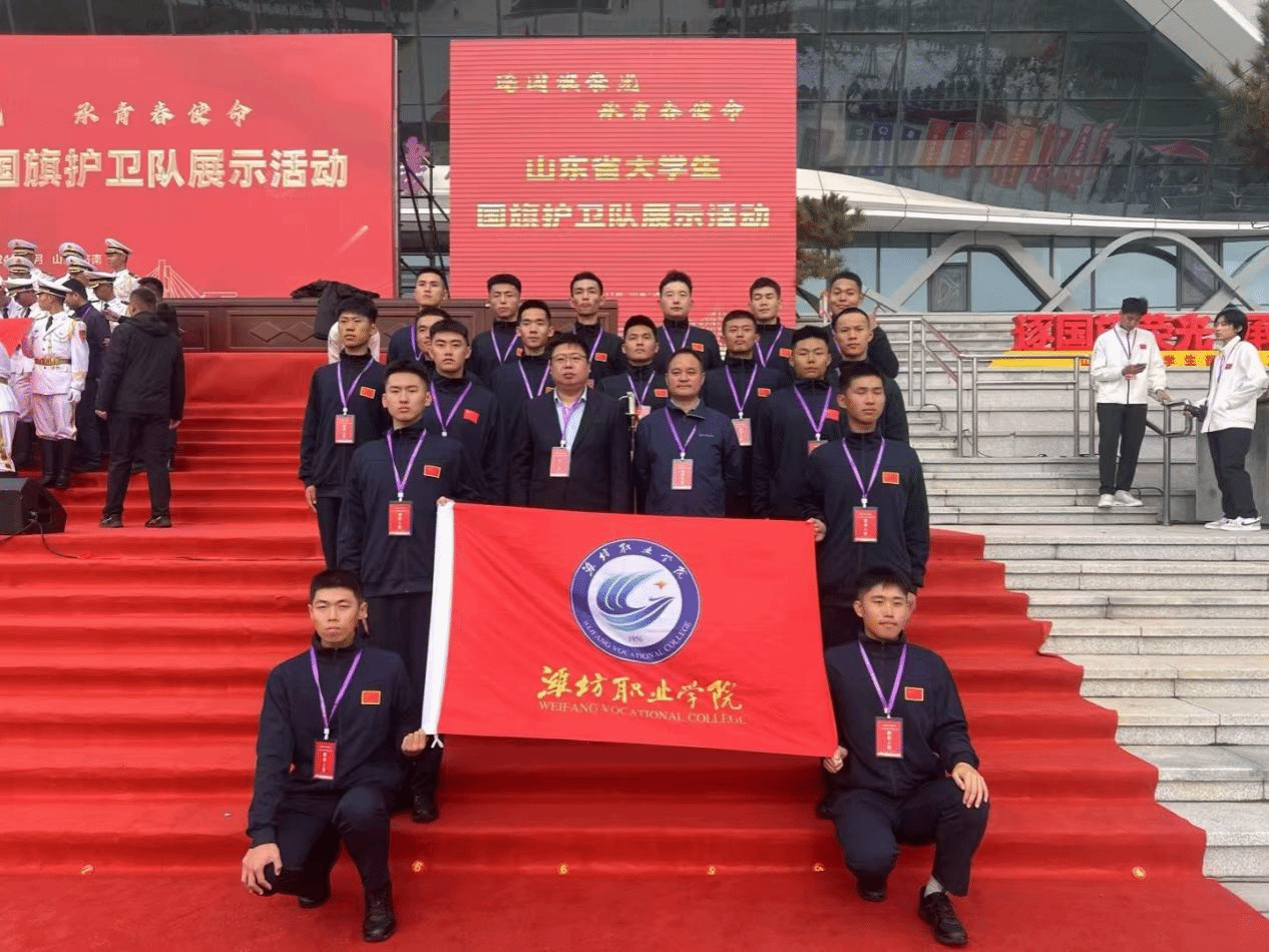 “逐国旗荣光 承青春使命”山东省大学生国旗护卫队展示活动由山东省教育厅、中共山东省委宣传部、山东省国防动员办公室、山东省军区政治工作局主办,全省142所高校参加初赛,20所高校入围现场决赛。比赛现场,我院参赛队员凭借昂扬的精神面貌、标准的动作要领、整齐划一的动作和口号,展现出潍职学子良好的精神风貌。