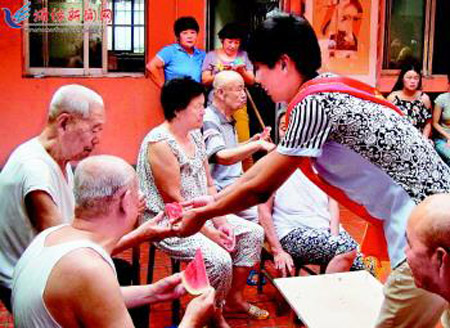 7月13日,志愿者在潍城区城关街道芙蓉街社区养老院给老人送上消暑西瓜。连日来,来自社区和潍坊职业学院的志愿者在该社区开展了以“炎炎夏日 送来凉意”为主题的志愿服务活动,他们在社区养老院打扫卫生、陪老人聊天,把浓浓的关爱送给老人们。 记者王晓光 通讯员纪秀艳摄