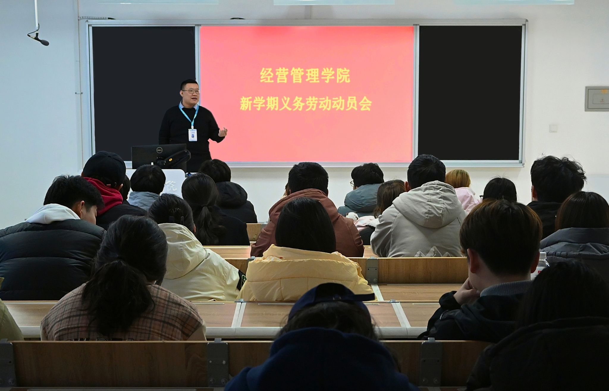 为贯彻落实劳动教育理念,引导学生树立正确劳动观念,增强社会责任感和集体凝聚力,推动学生德智体美劳全面发展,3月4日,经营管理学院在智泽2号楼B214阶梯教室召开新学期义务劳动动员会,辅导员老师以及在校班级劳动委员参加会议。