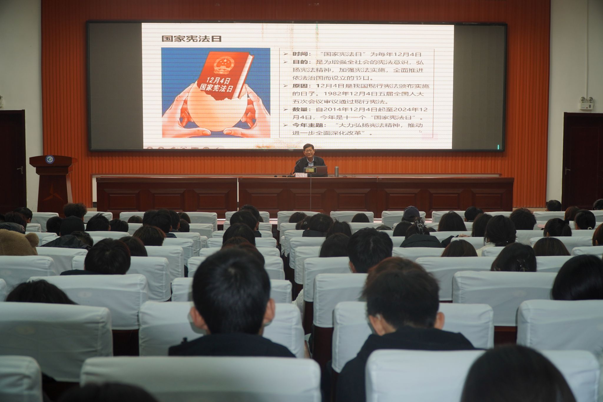 12月4日晚上,学院组织普法教育报告会。马克思主义学院邢庆亮教授介绍了“国家宪法日”确立的基本情况,以“学习法律知识,培养法治思维,争做新时代遵纪守法的大学生”为题作了一场精彩报告,全院300余名同学代表参加报告会,奎文校区青年法学社同学代表线上聆听报告会。邢教授结合生活常识、典型案例、社会热点对我国当前大学生犯罪形势和特点进行了详细讲解,对宪法、行政法、民法典、刑法等法律内容进行了详细解读,对大学生如何培养法治思维、践行依法办事理念提出了意见建议。此外,各二级学院同学集中收看了中央依法治国办、司法部、全国普法办、中央广播电视总台联合制作的“宪法的精神法治的力量——2024年度法治人物”专题节目。