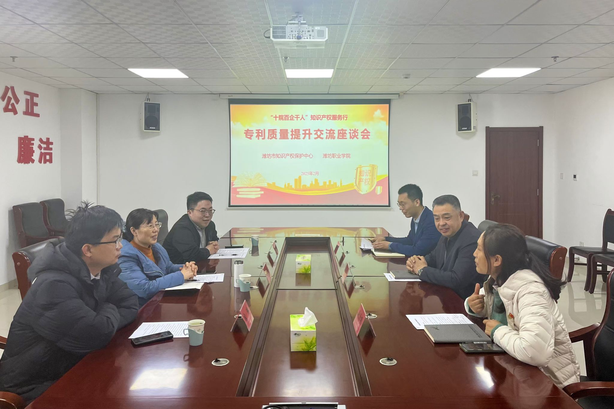 2月26日下午,学院副院长陈美霞带领科技处负责同志到潍坊市知识产权保护中心开展座谈交流活动。潍坊市知识产权保护中心主任王大海、副主任谢清明及相关科室负责同志参加座谈。