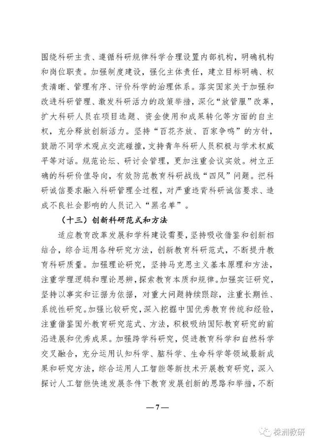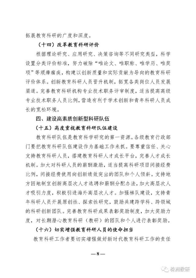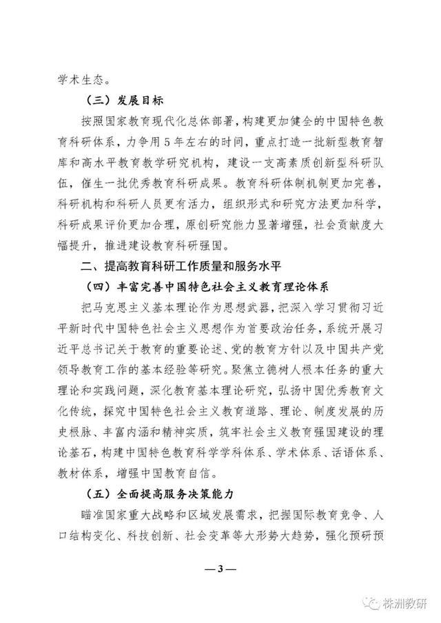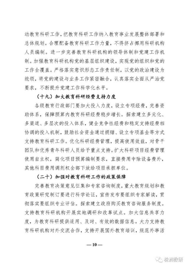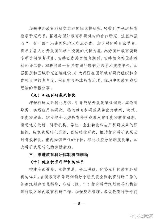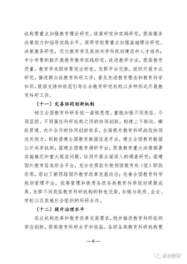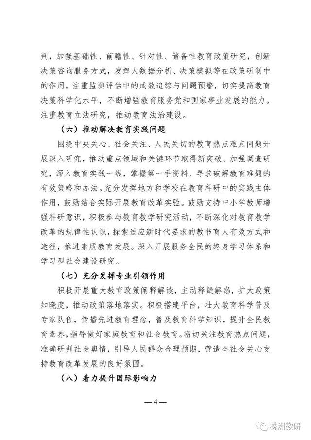《意见》进一步突出了教育科研在教育改革发展中的地位和作用,确立了新时代教育科研工作要以习近平新时代中国特色社会主义思想为指导、以“坚持正确方向、服务实践需求、激发创新活力、弘扬优良学风”为基本原则、以建设教育科研强国为发展目标的总体要求;提出了丰富完善中国特色社会主义教育理论体系、全面提高服务决策能力、推动解决教育实践问题、充分发挥专业引领作用、着力提升国际影响力、加强科研成果转化六个方面的重点任务;明确了健全教育科研机构体系、完善协同创新机制、提升治理水平、创新科研范式和方法、改革教育科研评价五个方面的教育科研体制机制创新;强调了高度重视教育科研队伍建设、切实增强教育科研工作者的使命担当、促进教育科研人员专业发展三个方面的高素质创新型科研队伍建设要求;强化了加强党对教育科研工作的全面领导、加大教育科研经费支持力度、加强对教育科研工作的政策保障三个方面的教育科研工作保障条件。
