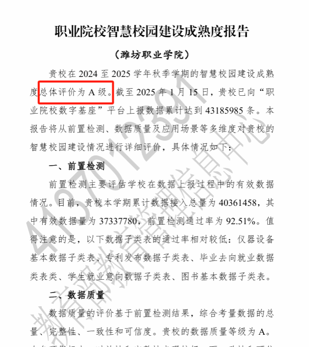 近日,教育部职成司、教育部信息管理中心发布2024年秋季学期《职业院校智慧校园建设成熟度评估报告》,我院继2024年春季学期获评A级以来,再次获得A级佳绩,数字化水平稳步走在全国第一方阵。