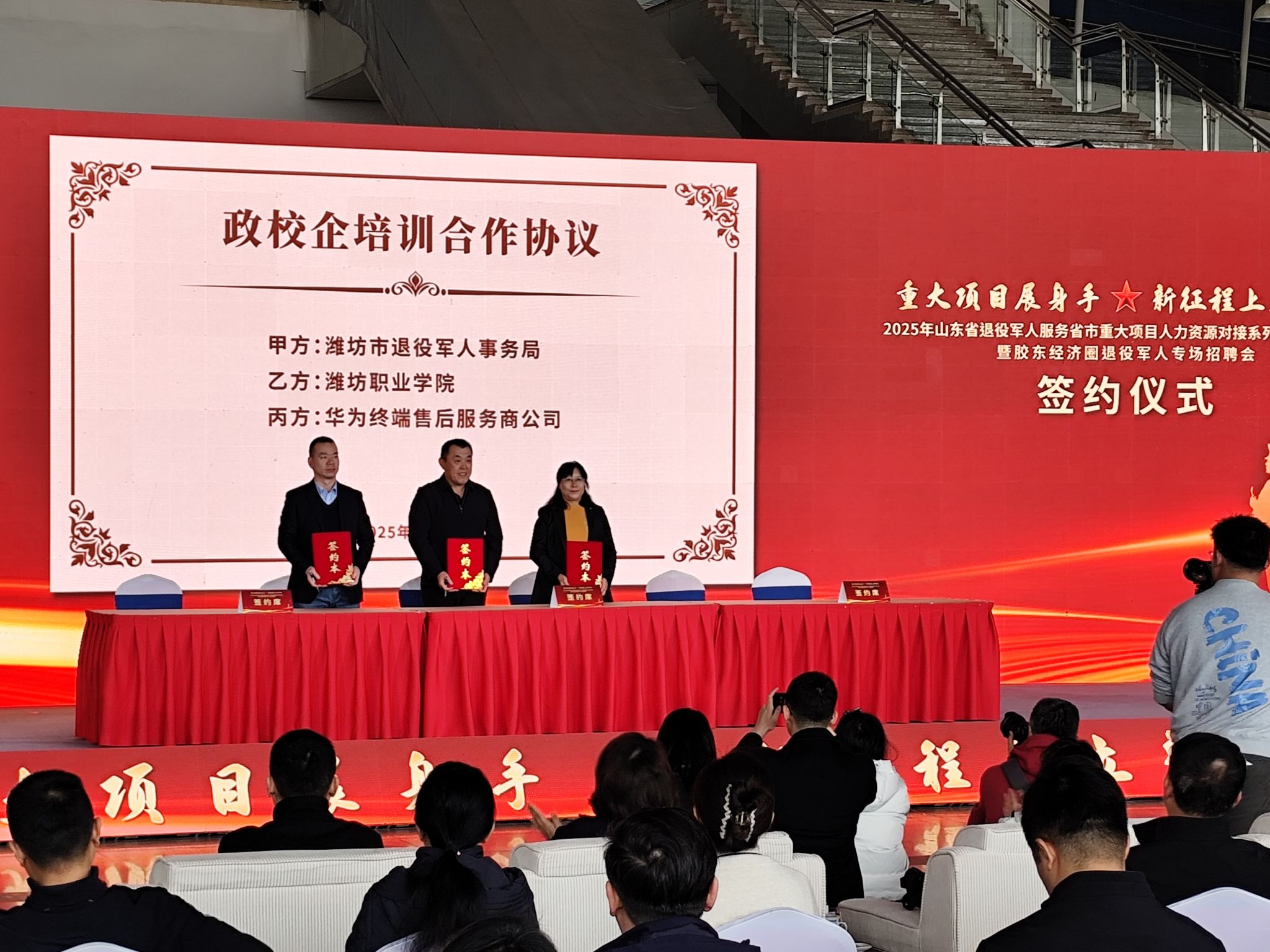 高凌云代表学院与潍坊市退役军人事务局、华为终端售后服务商公司签订政校企培训合作协议。我院和市退役军人事务局联合创办潍坊市退役士兵职业教育学院以来,一直致力于为退役军人提升专业能力、创造更多就业机会,始终把退役军人就业创业工作作为重中之重,已经连续三次面向退役士兵及随军家属举办专场招聘会。(王乾 李梅供稿)
