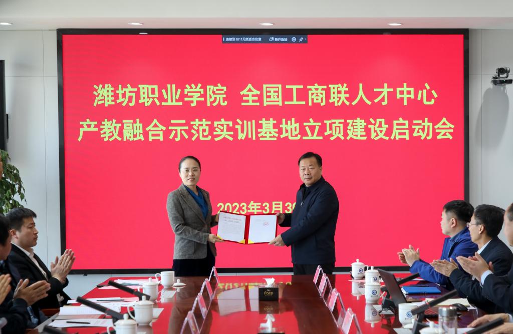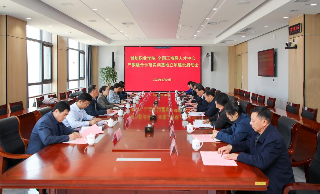 3月30日,全国工商联人才中心高端装备产教融合示范实训基地立项建设启动会在我院举行,全国工商联人才中心副主任张一卫,全国工商联人才中心产教融合示范实训基地项目专家马卉子,金砖国家技能发展与技术创新大赛国际贸易数字化能力赛项专家组组长宋钢,全国工商联人才中心产教融合示范实训基地业务负责人王晓勃,学院党委书记刘建成,学院党委委员、副院长贺志强,学院党委委员、副院长李瑞昌,潍坊工商联经济科科长路继新,学院科技处、教务处、机电工程学院相关负责人出席基地立项建设启动会。李瑞昌主持仪式。