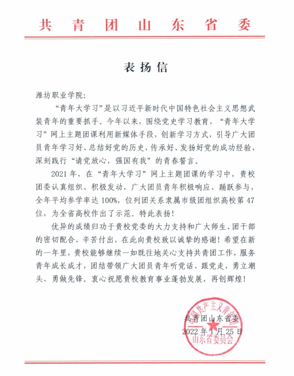 近日,学院收到共青团山东省委发来的表扬信,对我院2021年度“青年大学习”网上主题团课学习中取得的优异成绩进行表扬。