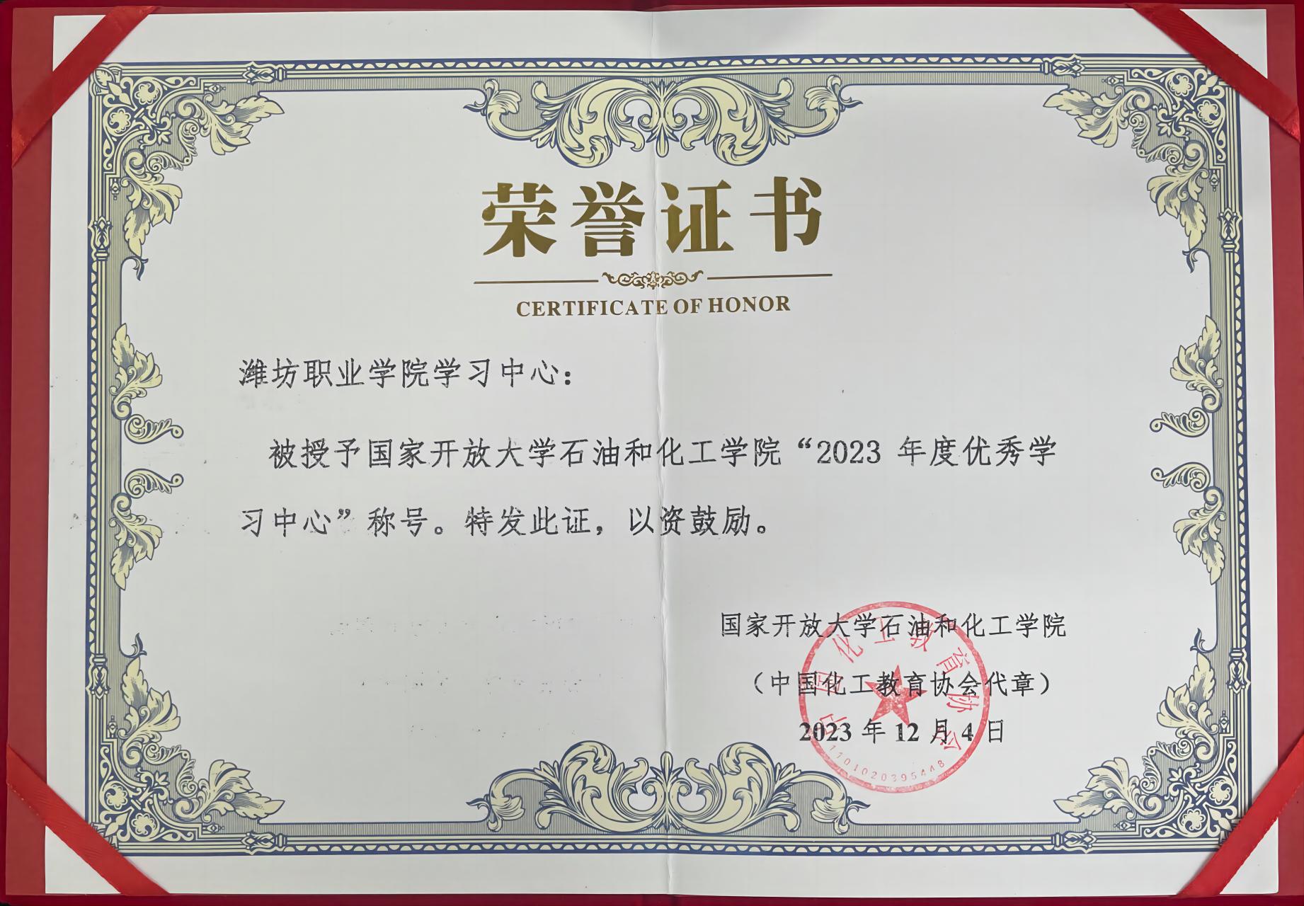 学院获评国家开放大学石油和化工学院“2023年度优秀学习中心”