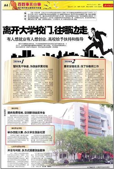 记者采访了解到,潍坊职业学院在学生创业教育方面也是态度积极,每年举行十几次企业家进校园的讲座以及优秀创业学子母校行的活动,用真实的案例鼓励学生创业。