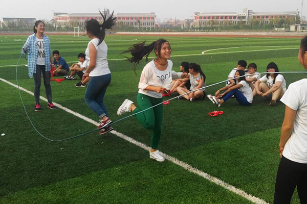 活动每4人1组,分“绑腿跑”和“跳绳答问题”两个环节。在“绑腿跑”环节,先到达终点者优先回答问题;“跳绳答问题”则是在限定时间内边跳绳边回答问题,知识问答主要涵盖了与农业相关的地理、文学、人文科学等方面的内容。每个环节都充分考验了学生运动能力、对专业知识的掌握能力,更是凸显了同学们之间协作能力。