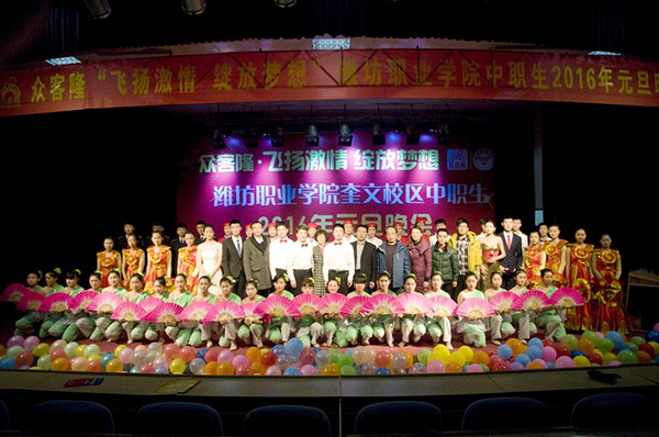 12月29日,由中专部举行的中职生“飞扬激情,绽放梦想”2016年元旦晚会在奎文校区16号楼报告厅举行。学院副院长贺志强以及各部门各二级学院负责同志与奎文校区中职师生观看了晚会。