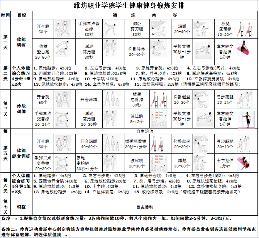 强体魄、战疫情、战必胜!为响应国家号召,通识教育中心积极贯彻落实学院《关于做好延迟开学期间在线授课工作》的通知要求,组织体育运动发展中心迅速制定《潍坊职业学院学生体育锻炼方案》,制作线上体能锻炼视频课,通过学院网站、微信群、QQ群等进行发布,指导学生在家进行体育锻炼。让学生足不出户,在家中按照锻炼方案、跟随视频进行体育锻炼。引导全体师生做到特殊时期不放松,在家也要练体能,强身健体,众志成城抗疫情,打好这场没有硝烟的战争。(王晓、徐之军供稿)