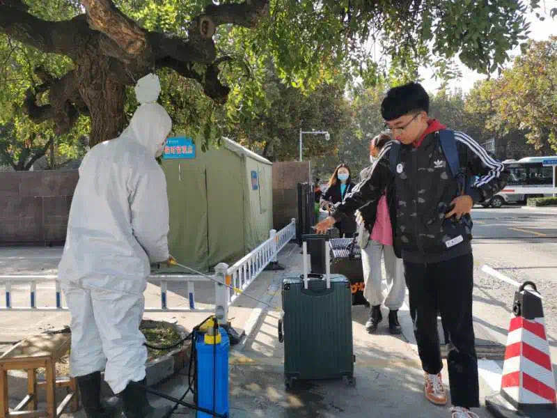返校师生根据志愿者的指引来到指定地点,严格遵守一米安全距离有序排队,通过健康码出示、体温测量、个人行李消毒后,随后将假期的旅居地、目的地等进行登记,及时掌握了返校人员活动轨迹。