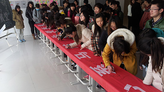 3月8日失联的马航MH370航班牵动着亿万人的心,国际商务学院于3月13日上午举行了“心系马航,为爱祈福”签名活动,同学们纷纷表达了自己对失联飞机MH370航班的关注和祝福。条幅上除了师生们的签名,还写满了祝福的话语。韩国外教和部分教师也与同学们一起参加了签名活动。(黄言青供稿)