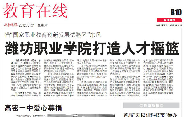 作为全省第一批“两区”建设专项资金资助项目的潍坊职业学院滨海校区建设项目,顺势应时,抓住这一历史发展机遇,全力加快滨海新校区建设步伐。预计今年9月份,将迎来第一批3500名学生入住新校区。