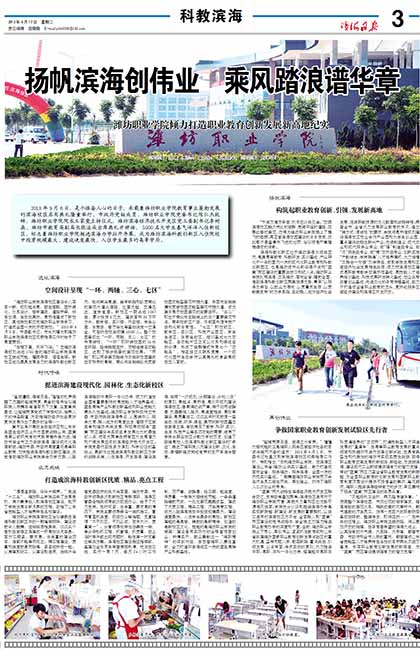黄河三角洲高效生态经济区和山东半岛蓝色经济区上升为国家战略以来,蓝黄浪潮以前所未有的气势席卷齐鲁大地,潍坊市举全市之力突破滨海、建设现代化滨海新城。潍坊市委、市政府高度重视高等职业教育,加快推进滨海科教创新区建设,决定借助潍坊职业学院综合办学优势,入驻滨海推动中高职一体化办学,倾力打造在全国有重要影响的高技能人才培养基地、蓝色高端产业科教创新基地和职业技能大赛永久性基地。潍坊职业学院积极响应市委、市政府号召,从围绕中心、服务大局、融入地方的高度出发,着眼于区域竞争和潍坊未来发展,积极寻找服务“蓝黄”两区建设与实现自身发展壮大的最佳切入点,把目光聚焦在拥有巨大发展潜力和广阔发展空间的滨海经济技术开发区。学院党委行政在多方谋划、科学论证的基础上,果断作出挺进滨海科教创新区办学的战略决策,按照“一次规划、分期建设、分批入住”原则,高起点、高标准、高水平规划建设滨海校区,春潮涌动战严寒,挥汗如雨战酷暑,机器轰鸣人胜天,高速度推进,高效率建设,高质量竣工,仅仅三年时间就使一座现代化、园林化、生态化、开放型的校园矗立在渤海之滨,办学资源全部搬迁配置到位,有效满足了教学、科研、实训、生活、科技产业等各项功能的需要,结束了学院长期五校区分散办学的历史,创造了驻潍高校入驻滨海科教创新区建设的“奇迹”,表达了潍职院人为建设创新、文化、生态、幸福新潍坊掷地有声的庄严承诺与誓言。