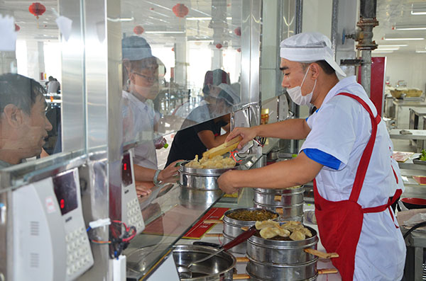 食品安全重于泰山,学院餐厅是大家共同关注的一个大焦点,学院后勤服务处把食堂承包招标工作作为部门工作的重中之重,用后勤服务处副处长王泉的话说就是在每一个数字上“斤斤计较”,细致把关,狠抓食品质量,加强卫生建设。招标工作完成后,后勤服务处工作人员与中标单位共同采购必备的厨房设备,严把质量关,让滨海校区的每一位师生都吃上放心饭菜,吃得舒心,喝得安心。正在窗口前打饭的同学齐文文举着餐盘一边说:“今天尝尝藕片怎么样,食堂的饭菜非常合我胃口,花样还多,也非常干净卫生,最主要的是价格便宜,今天这顿饭两个菜一个馒头,还不到5块钱。”同伴赵兴芳指着不远处的江西瓦罐煨汤窗口兴奋地说:“你看,这还有江西名吃,下次咱们再尝尝那个,咱们要挨个把餐厅的饭菜尝一遍。”