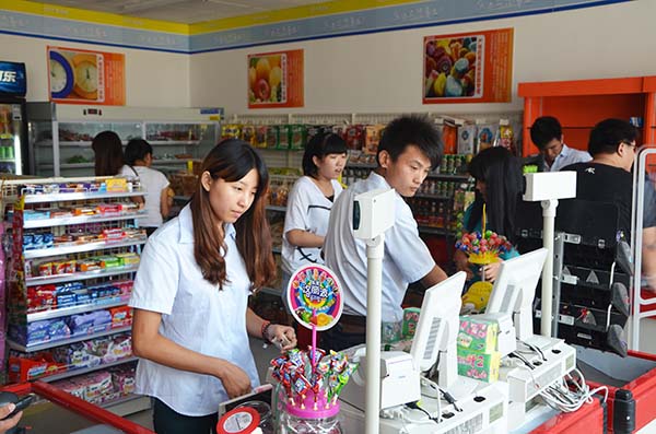记者远远地看到,餐厅旁边的中百超市非常热闹,同学们进进出出,有说有笑。走进超市,记者发现超市的售货员都着装统一,非常年轻,他们的脸上洋溢青春和活力。经营管理学院院长张建奎笑着说:“这些都是我们的学生和老师,这个中百超市除了满足同学们的生活需要外,还是我们学院的连锁经营实训中心,物流管理、会计电算化、连锁经营、客户服务专业的中高职学生都可以在这里进行实习实训,它的运营都是由我们自己学院的老师和学生们进行管理负责。目前,我们学院的5位专业教师和14名学生,经过系统的岗前培训后已正式上岗,分别从事收银、理货、采购、保洁等工作,专业知识得到了很好地应用。”